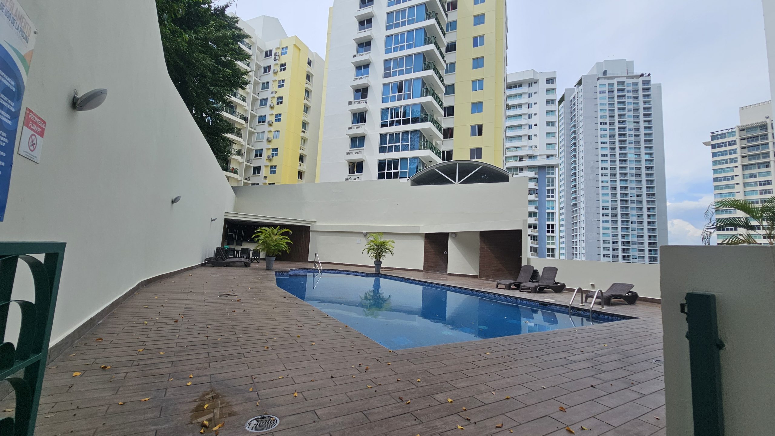 Área social con piscina, zona BBQ y salón de eventos.